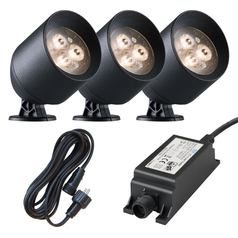 This kit comes with 3 x Laros spotlights, 1 x 8mtr SPT-1 cable and 1 x transformer (12W or 24W). To work out which transformer is best for you, simply add up the total wattage of the lights and pick the transformer that is either the same number or bigger. An example of this would be 15 x Laros spotlights = 15W, you would therefore you would need the 24W transformer. The 8mtr cable in this kit is a plain cable allowing you to connect the lights anywhere along that length of cable. You don't need additional connectors as each light comes with it's own connector.
