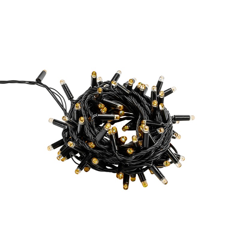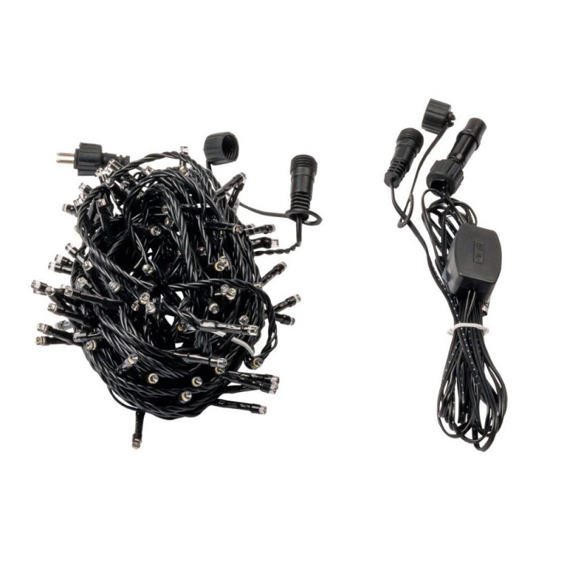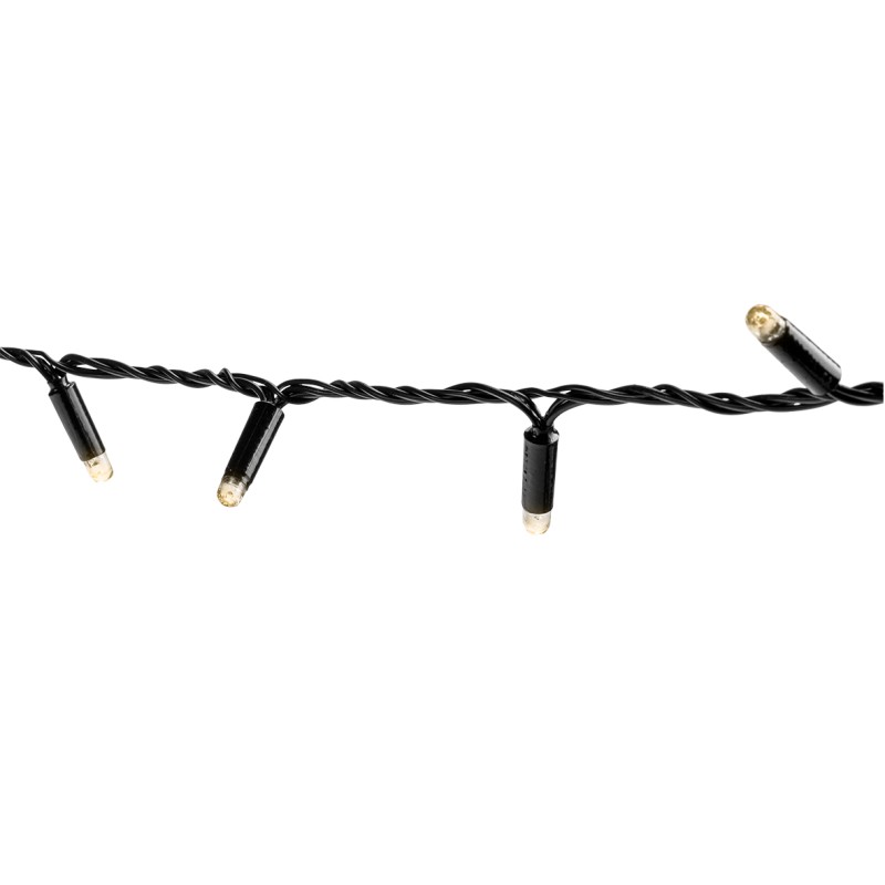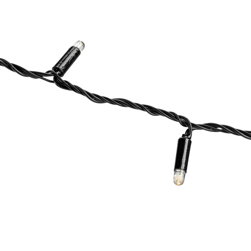 Description: Linea 100x warm white static leds. 10mtr length from first to last bulb and a 3mtr lead in. Up to 5 sets can be connected end to end..